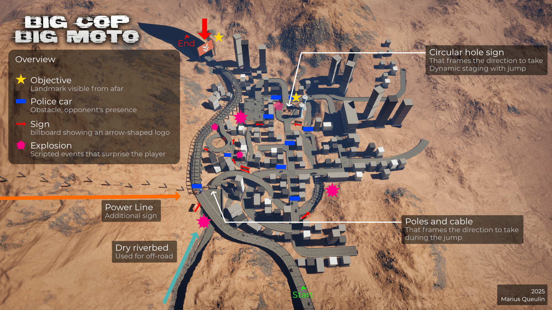 C’est pourquoi, en lien avec les rythmes, la verticalité et les effets de surprise que je souhaitais intégrer au gameplay, j’ai réfléchi en amont au terrain, au placement des routes, des bâtiments, de la rivière asséchée, etc., en travaillant aussi bien l’architecture macro que micro du niveau.