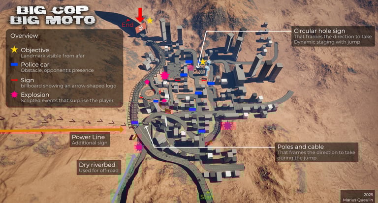 Cependant, pour Big Cop Big Moto, j’ai choisi de pousser cet aspect, à la fois pour renforcer l’immersion de l’expérience, mais aussi pour progresser sur le plan personnel et développer mes compétences en level design.